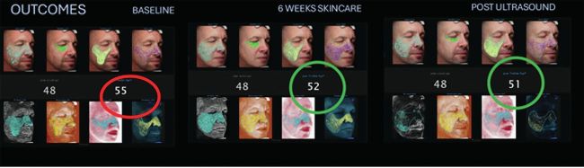 Objective outcomes were compelling. Following six weeks of A.G.E. monotherapy, patients demonstrated an average reduction of -two years in true skin age as measured by the Canfield VISIA system. At eight weeks post-ultrasound integration, this improvement increased to an average reduction of -4.5 years compared to baseline. Clinically, improvements were observed across firmness, tissue adherence, and lifting vectors supported by Canfield H2 Vectra volumetric analysis. A volumetric increase of +1.14ml was observed across the mid facewith a -2.48ml volumetric reduction in the lower face. This volume redistribution is considered beneficial, particularly in view of counteracting the bottom heaviness, that can typically occurs with the ageing process. The results demonstrate a positive clinical outcome.